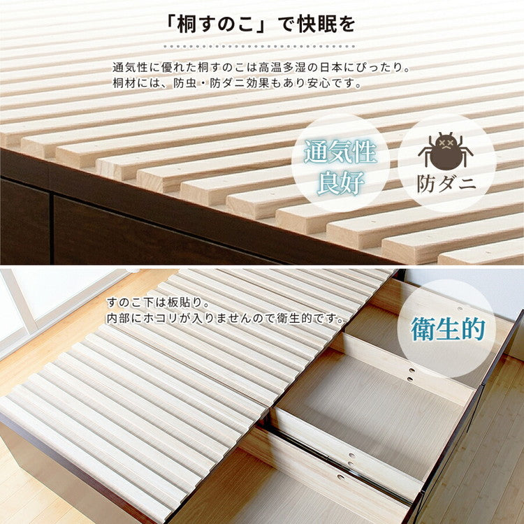 床板は すのこ形状 で「桐材」を使用していますので、通気性も良く清潔にお使いいただけます。 「BOX構造」ですから、ホコリが引き出し内に落ちません。
