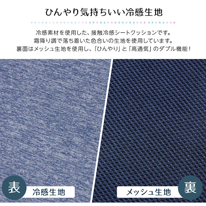 表面はひんやり接触冷感生地で涼しげな座り心地、裏面は通気性のよいメッシュ生地を使用しております。