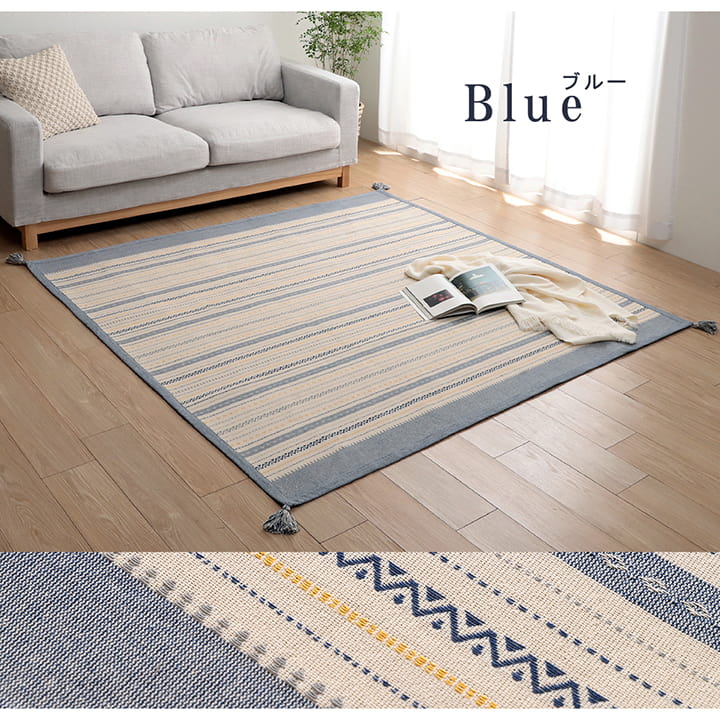ラグ 正方形 インド綿 3畳 185×240cm 吸湿性 シンプル ナチュラル 幾何学 ボーダー タッセル付き コンパクト ホットカーペット対応 床暖房対応 オールシーズン(代引不可)