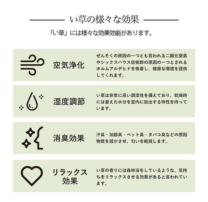 い草の癒される香りとサラッとした肌触りはそのままに、和室や洋室にも合わせられるインテリア性の高いナチュラルシンプルなデザインで仕上げています。