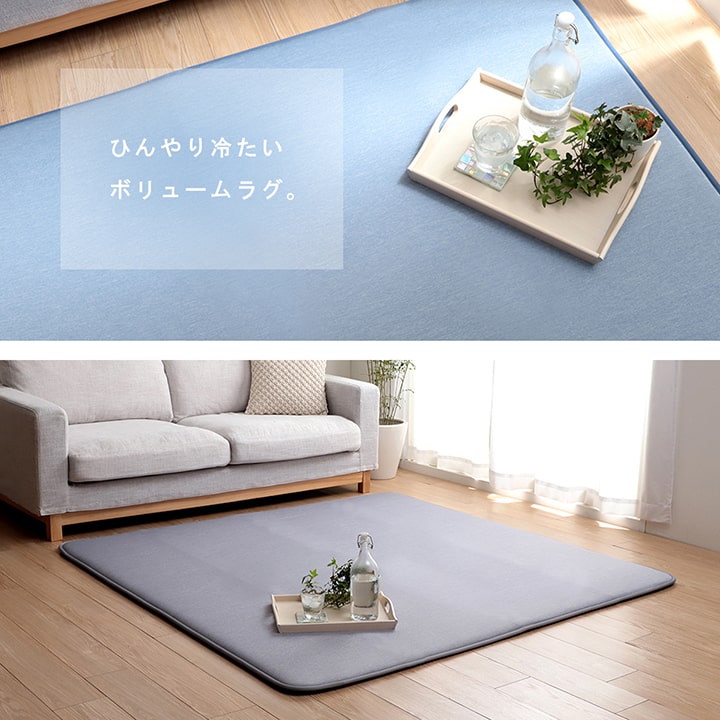 触れるとひんやり感じる接触冷感生地を使用しています。少しエアコンを効かせたお部屋で使用すると、よりひんやり感を実感していただけます。中材にウレタン30mmを使用したボリュームタイプです。8万回の耐久試験にクリアした、へたりにくい、耐久性抜群の極厚ラグです。 クッション性と弾力性があるので、フローリングで寝転んだり、テレビ鑑賞したり、本を読んだりとフローリングでくつろぎたい方におすすめです。ウレタンの厚みで生活音や足音も軽減。階下への騒音対策にもおすすめです。裏面は滑りにくい加工を施しているので、小さなお子様が走り回っても安心です。