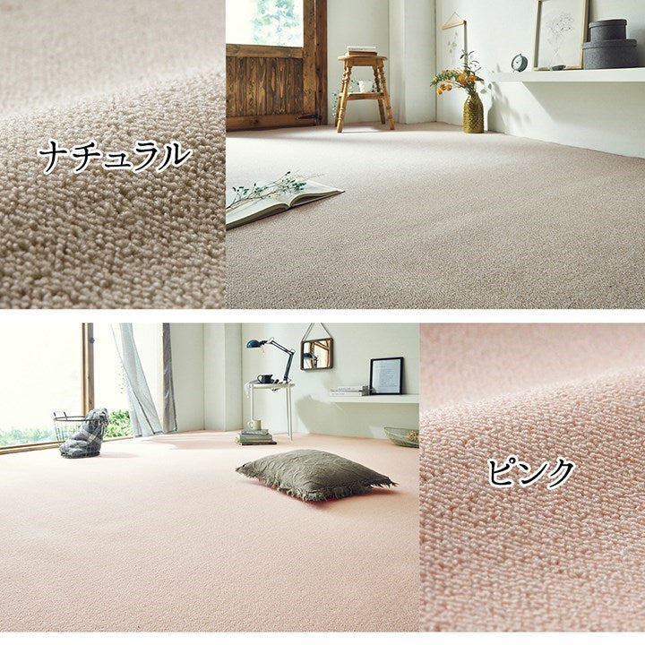 安心の日本製カーペットです。表地には撥水加工を施しておりますので,汚れにくくお手入れも簡単です。表地のパイル部分にはナイロンを使用しています。ナイロンは強度や摩耗に強く,速乾性があり,また遊び毛も出にくいなどの特徴があります。敷き詰めカーペットとしてのご使用にも適しています。抗菌防臭機能付きで,季節を選ばずオールシーズンご使用頂けます。安心の防炎加工です。フローリングを傷つけにくいよう,裏には不織布を貼っております。