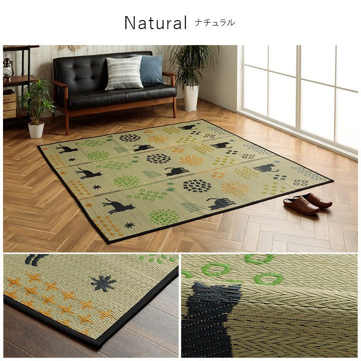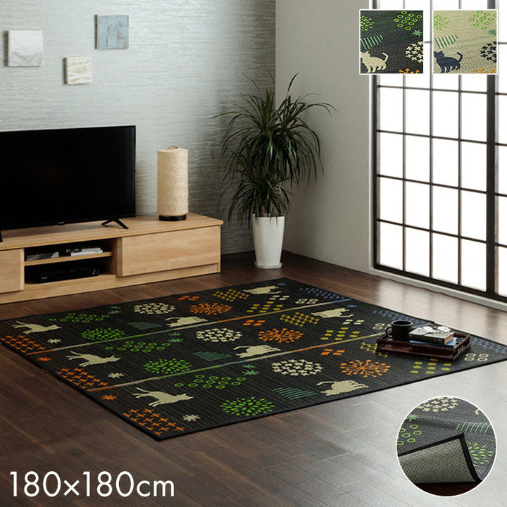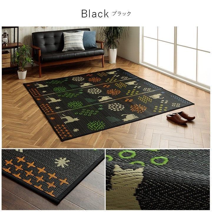 い草ラグ 猫柄 花柄 猫 インテリア 節電 夏用 涼しい おしゃれ おすすめ 湿度調節 消臭効果 お手入れ簡単 ブラック 約180×180cm はなねこ(代引不可)