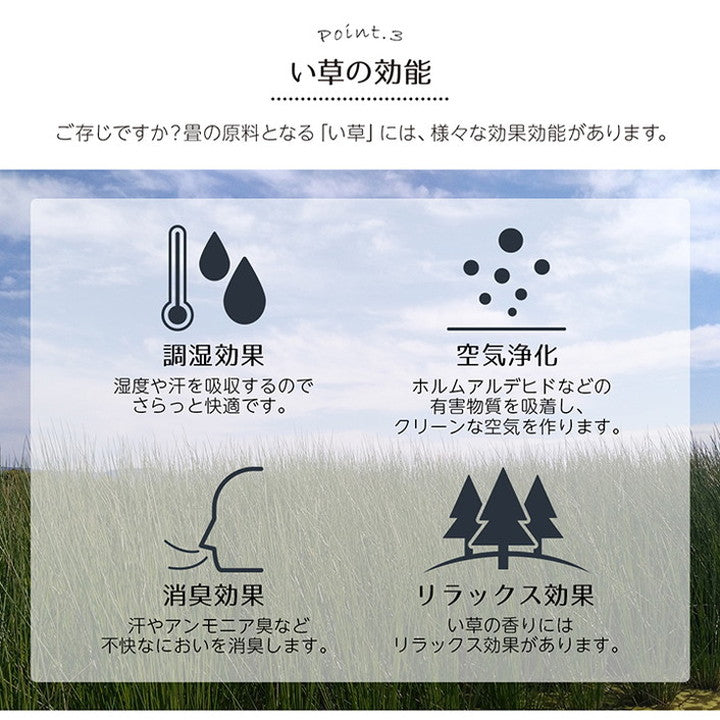 天然素材のい草には、お部屋の空気をきれいにする空気清浄効果、お部屋の湿度を調整する調湿効果、汗臭、ペット臭などの嫌な臭いを消臭する消臭効果など優れた機能性があります。