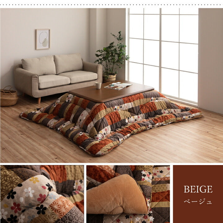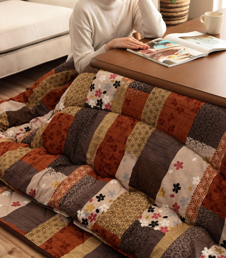 和柄のこたつ布団です。熱が逃げにくいフィットキルト加工を施しています。生地には綾織りの肉厚生地を使用しています。こちらの商品は国内でプリント、綿入れしています。日本製のプリントらしい上質な質感と繊細な文様をお楽しみ下さい。直接肌に触れる裏地部分にはフランネルと呼ばれる、しっとり柔らかな生地を使用しています。部分暖房のこたつは電気代もおトクです。