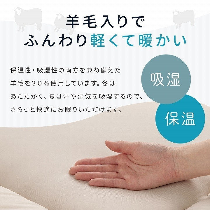 羊毛入りのため、冬は暖かく、夏は汗や湿気を吸湿するので、さらっと快適にお眠りいただけます。