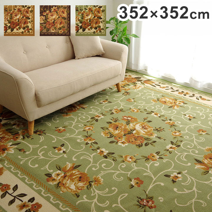 ナイロン 花柄 カーペット 江戸間8畳約352×352cm 撥水 速乾 グリーン エレガント 絨毯 じゅうたん マット インテリア 北欧 おしゃれ オールシーズン 新生活 高級感(代引不可)