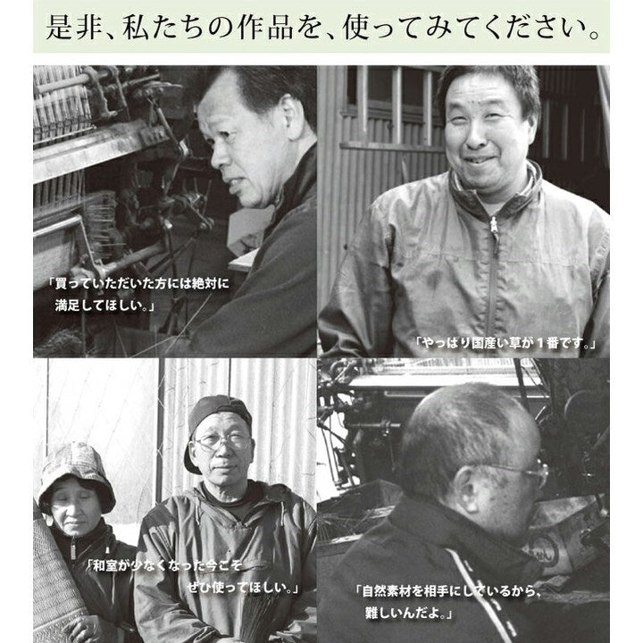 現代のライフスタイルに合う、洗練されたモダンなデザインのイ草カーペットです。国産(九州産)のい草を使用しています。一本一本が太く、表皮が厚く繊維がキメ細かいので弾力性があり、耐久性に優れています。い草には空気の自然浄化作用、湿度の調節作用などがあります。また汚れにくく、使用するうちに黄金色に変化し味が出ます。い草に青森ヒバ加工を施しています。(抗菌、防臭効果)