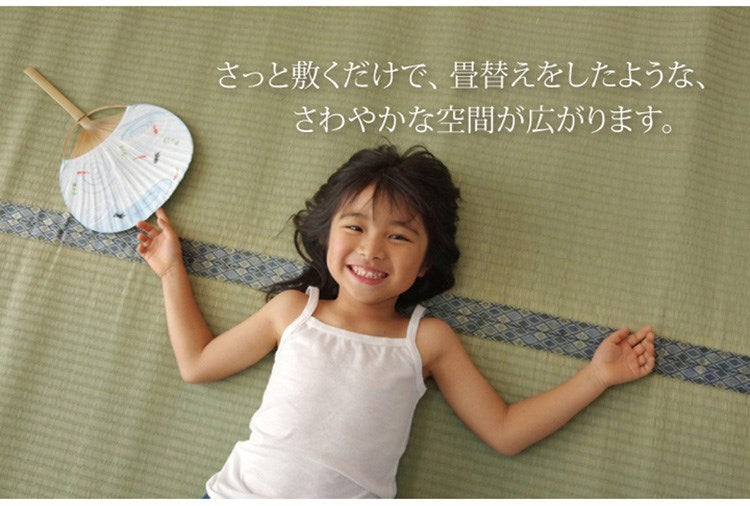上敷きを敷くだけで畳のお部屋をリフレッシュ出来ます。日焼けしてしまった畳のリフレッシュに、新品の畳を汚さないためのカバーにご使用下さい。長さ115~120cm程の国産(九州産)い草を使用しています。そのうち約88cmを使用しています。ヘリ際は多少白みを帯びます。(日焼けではありません、い草の根元と先端部分の色です。)い草は長いものほど高級になります。い草は先端部分が赤茶色く、根元が白く真中が青(緑)色です。真中の良質な青の部分を多く使用するほど、丈夫で綺麗な仕上がりとなります。またイ草は使用するうちに日焼けをしますが、真中の青の部分を多く使用したものほど、全体が綺麗にムラなく日焼けし、味が出ます。こちらの商品は畳表と同じ織り方の糸引織で仕上げました。双目織りと比べて、い草の打ち込み本数が多いため丈夫です。表面が滑らかなので、ホコリなどがたまりにくいのが特徴です。長くご使用されたい方や、耐久性をお求めの方には糸引織をおすすめします。国産(九州産)のい草を使用しています。国産い草は一本一本が太く、表皮が厚く繊維がキメ細かいので弾力性があり、耐久性に優れています。い草には空気の清浄化作用、湿度の調節作用があり、汚れにくいといった特徴があります。い草に青森ヒバ加工を施しています。(抗菌、防臭効果)表裏の両面が使えて経済的です。