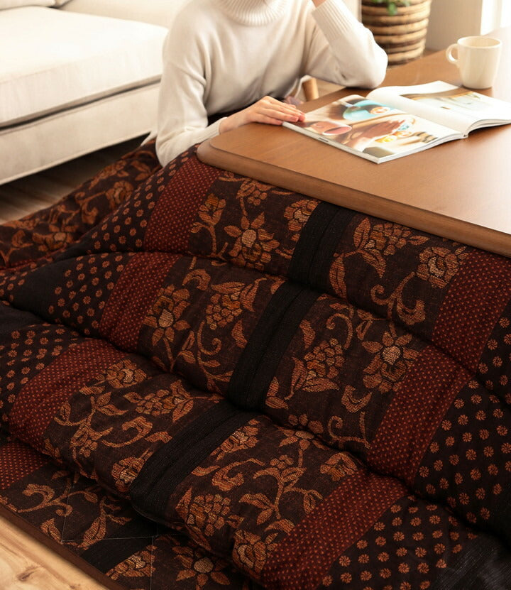 和モダン柄のこたつ布団です。熱が逃げにくいフィットキルト加工を施しています。生地に撥水加工を施しています。生地には肉厚で張りと光沢のある綿素材を使用しています。こちらの商品は国内でプリント、綿入れしています。日本製のプリントらしい上質な質感と繊細な文様をお楽しみ下さい。部分暖房のこたつは電気代もおトクです。