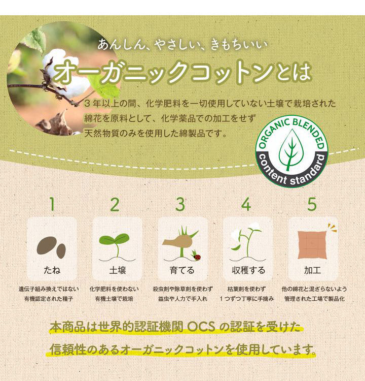 側地にインド綿100%のオーガニックコットンを使用し、ざっくりとした肌触りが特徴で、季節を問わず一年中心地よくお使いいただけます。