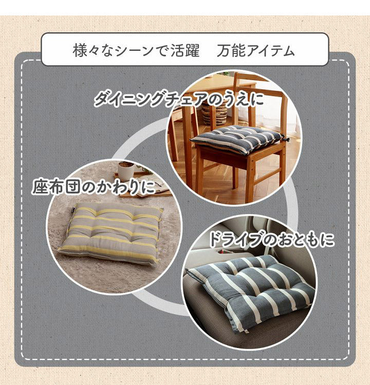 シンプルで飽きの来ないデザインで、ダイニングチェア、車のシートなど様々なシーンでご使用いただけるシートクッションです。