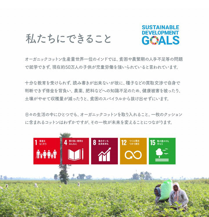 側地にインド綿100%のオーガニックコットンを使用し、ざっくりとした肌触りが特徴で、季節を問わず一年中心地よくお使いいただけます。