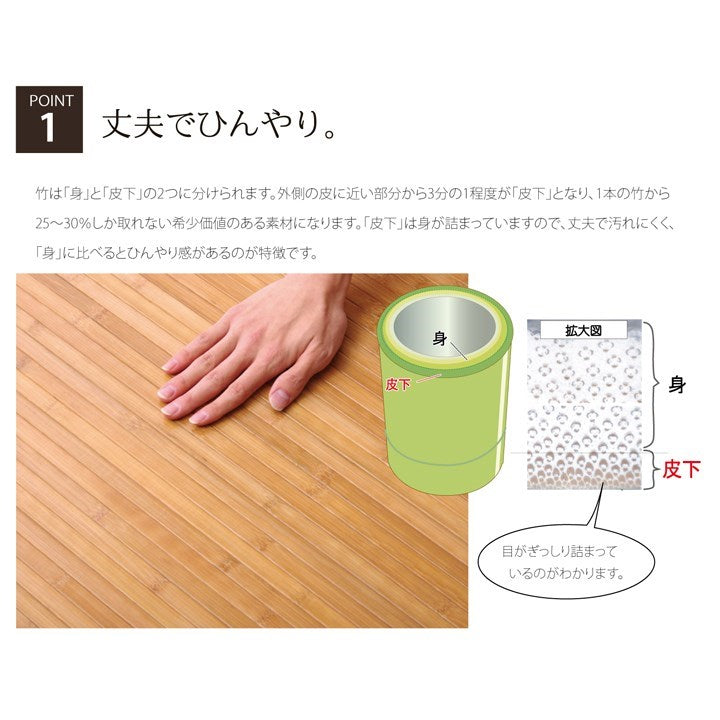 孟宗竹の表面付近の目がぎっしり詰まった部分のみを使用した竹ラグです。表面部分は特に汚れにくく耐久性に優れ、熱伝導率が高いため、ひんやり感も抜群です。表面の肌触りを滑らかにするため、また竹の色を揃えるためにUV塗装を施しています。また無垢材を使用し、あたたかみのある質感に仕上げました。スモークすることで色を出しています。染料、顔料は使用していません。シンプルな糸無しの張り付けタイプです。素材は皮下17mm幅の竹ヒゴを使用しています。17mmの竹ヒゴは大きく育った竹からしか取れない素材です。竹は他の木材と比べると格段に成長が早く(3~5年で成竹)、持続的生産が可能な環境に優しいサスティナブルな素材です。