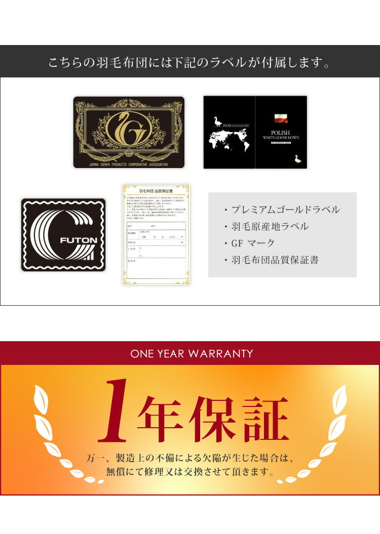 ※羽毛は天然素材のため、無臭ではございません。原毛は洗浄を十分に行っておりますが、開梱直後や温度・湿度等の環境等により臭いを感じる場合がございますので、開封直後には風通しの良い場所での十分な陰干し等をお勧めいたします。なお、天然羽毛の臭いのため人体に害はございませんのでご安心ください。