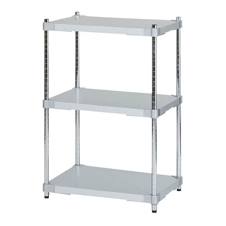 ■材質:棚板=ガルバリウム鋼板、コーナー部=アルミダイキャスト(紛体塗装)、ポール=スチール(クロムメッキ)、キャップ=ポリエチレン、アジャスター=ABS樹脂、テーパースリーブ=ABS樹脂