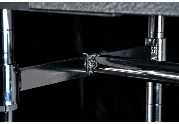 ■材質:棚板=ガルバリウム鋼板、コーナー部=アルミダイキャスト(紛体塗装)、ポール・ハンガーパイプ=スチール(クロムメッキ)、キャップ=ポリエチレン、アジャスター=ABS樹脂、テーパースリーブ=ABS樹脂、キャスター=スチール
