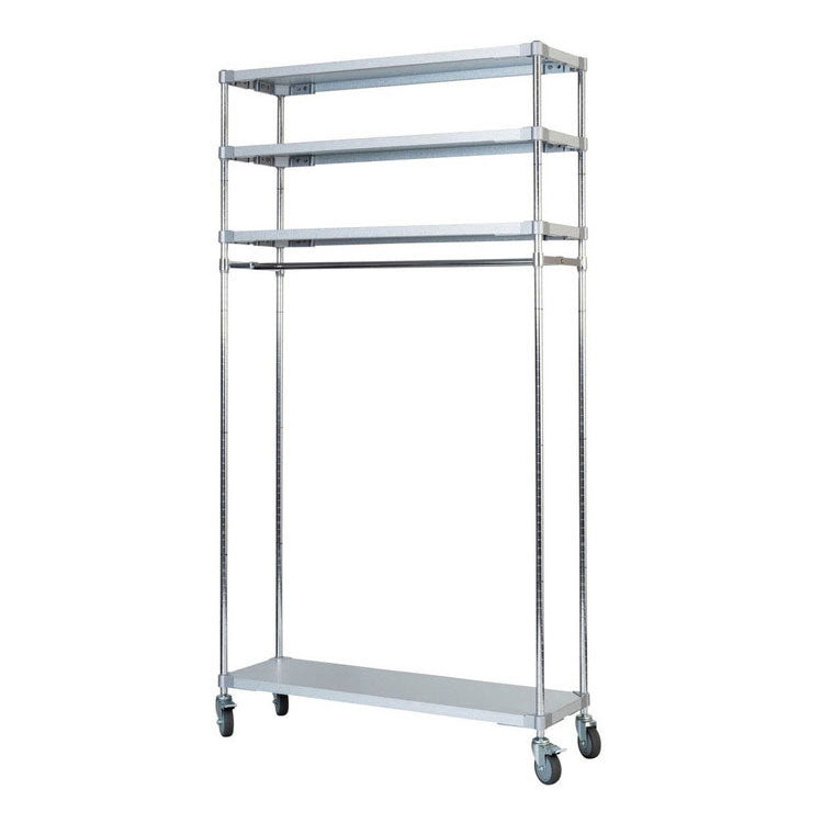 ■材質:棚板=ガルバリウム鋼板、コーナー部=アルミダイキャスト(紛体塗装)、ポール・ハンガーパイプ=スチール(クロムメッキ)、キャップ=ポリエチレン、アジャスター=ABS樹脂、テーパースリーブ=ABS樹脂、キャスター=スチール