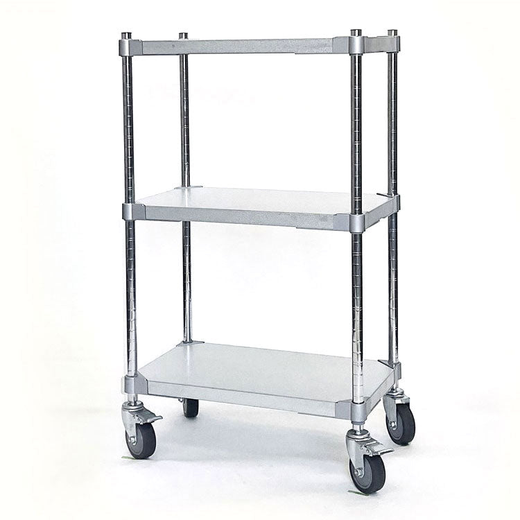 ■材質:棚板=ガルバリウム鋼板、コーナー部=アルミダイキャスト(紛体塗装)、ポール=スチール(クロムメッキ)、キャップ=ポリエチレン、アジャスター=ABS樹脂、テーパースリーブ=ABS樹脂、キャスター=スチール