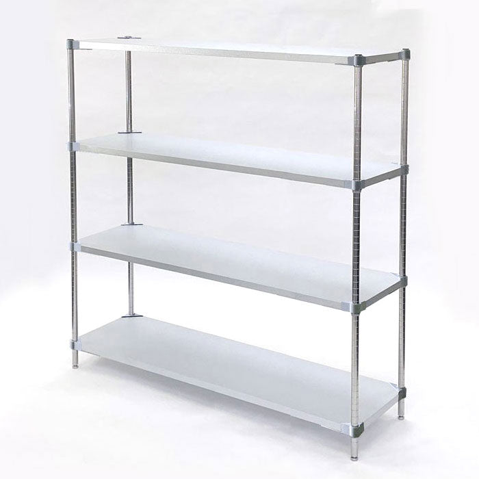 ■材質:棚板=ガルバリウム鋼板、コーナー部=アルミダイキャスト(紛体塗装)、ポール=スチール(クロムメッキ)、キャップ=ポリエチレン、アジャスター=ABS樹脂、テーパースリーブ=ABS樹脂