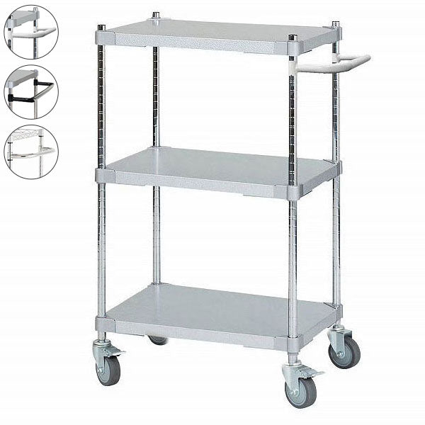 ■材質:棚板=ガルバリウム鋼板、コーナー部=アルミダイキャスト(紛体塗装)、ポール・ハンドル=スチール(紛体塗装)、テーパースリーブ=ABS樹脂、キャスター=スチール
