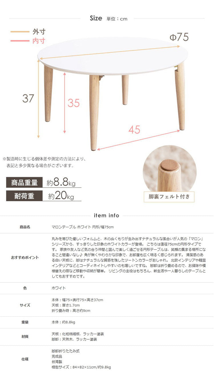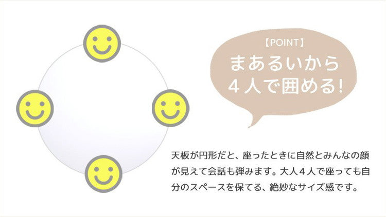 丸みを帯びた優しいフォルムと、木のぬくもりが生み出すナチュラルな風合いが人気の「マロン」シリーズから、すっきりした印象のホワイトカラーが登場。 こちらは直径75cmの円形タイプです。 家族や友人など気の合う仲間と囲んで楽しく過ごせる円形テーブルは、笑顔の集まる場所になること間違いなし♪ 角が無くやわらかな印象で、お部屋も広く明るく感じられます。 清潔感のある白い天板に、脚はナチュラルな質感を残したツートンカラーがおしゃれ。 北欧インテリアや韓国インテリアなどとコーディネイトしやすいのも嬉しいですね。 脚部は折り畳めるので、お掃除や模様替えの際など移動や収納が簡単。 リビングの主役はもちろん、新生活や一人暮らしのテーブルとしてもおすすめです。