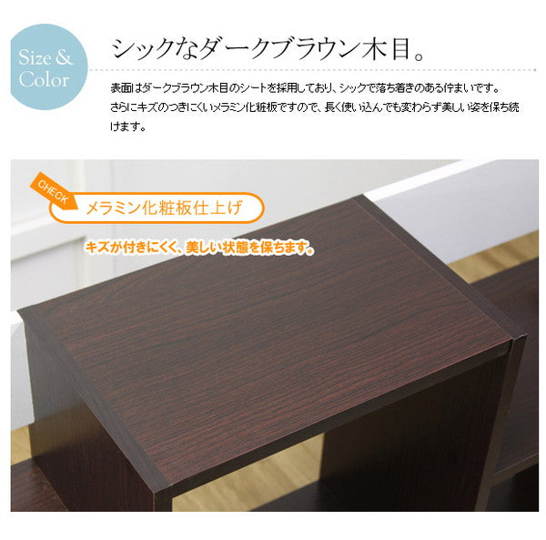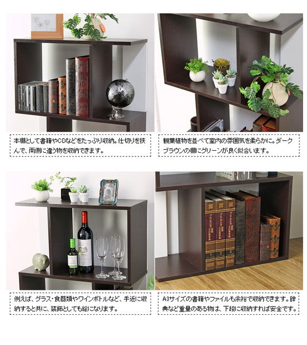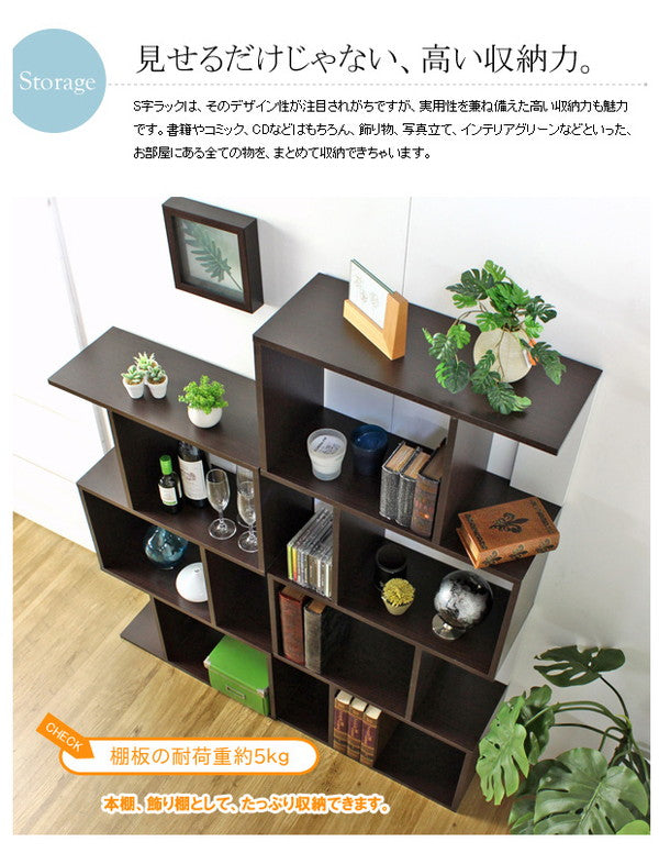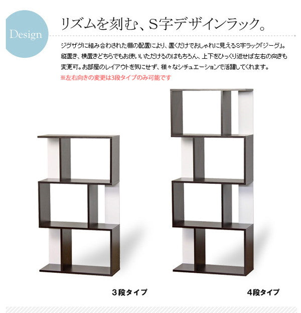 置くだけでお洒落に見えて、お部屋をセンスアップできるS字ラック・ジーグ。左右、縦横、どんな向きでもお使いいただけるので、お部屋のレイアウトを気にせず、様々なシチュエーションで活躍してくれます。カラーはシックなダークブラウン木目。キズの付きにくいメラミンシートを採用しており、美しい状態を長く保ちます。サイズは3段と4段の2サイズをご用意しました。