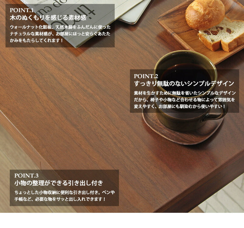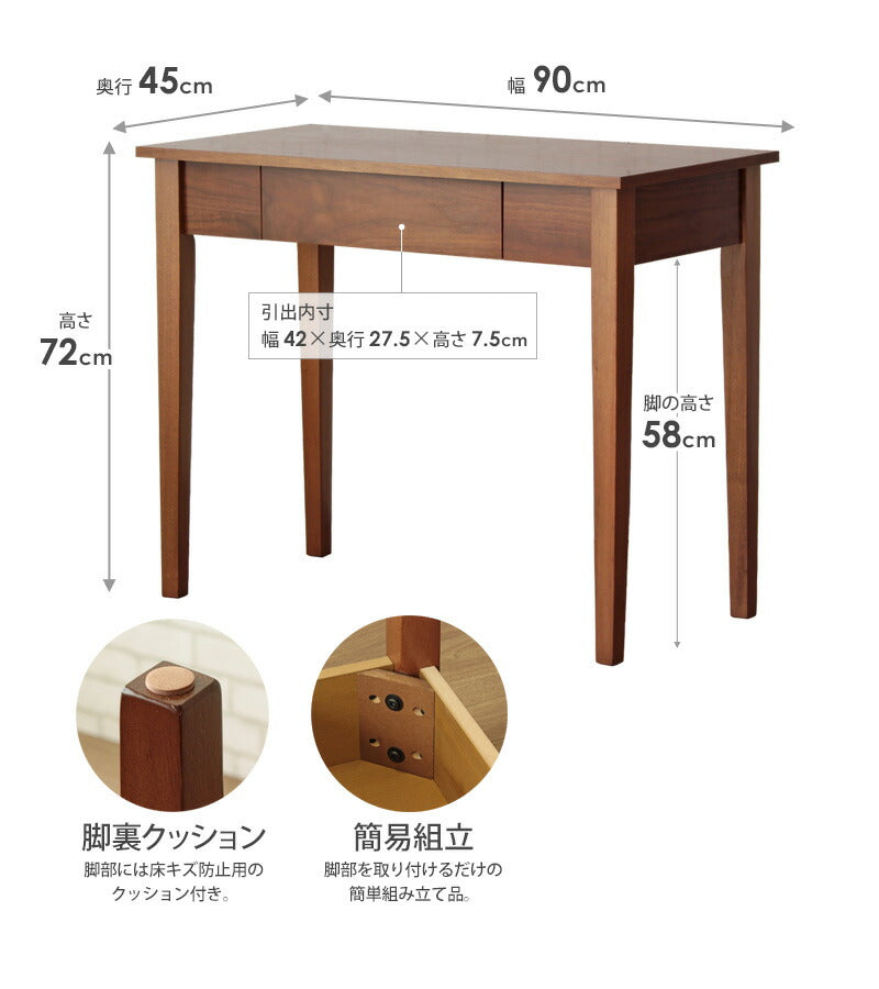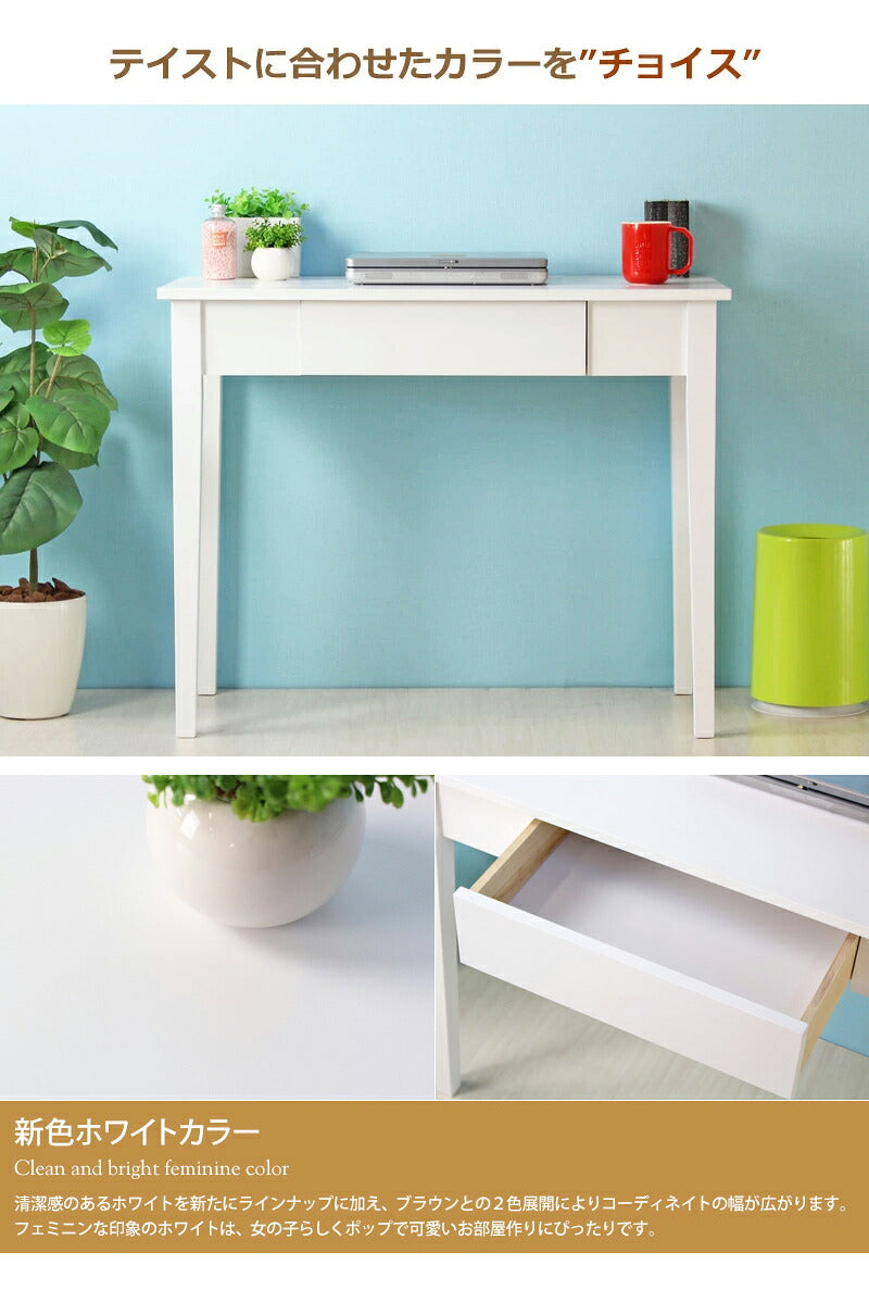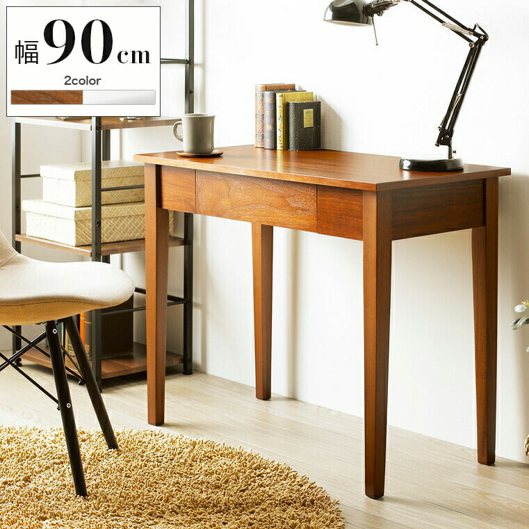 PRポイント:清潔感のあるホワイト塗装で仕上げられた、シンプルデザインの木製デスク。オール木製にこだわることで素朴なぬくもりのある風合いを醸し出し、白一色にすることで、洗練された明るい空間を演出します。天板サイズ幅90cm×奥行45cmと、場所を取らないコンパクトな省スペースサイズ。引き出しも付いて、小物の整理もお手の物です。デスクとしてはもちろん、コンソールとしてFAX台や飾り棚の用途でもおしゃれです。