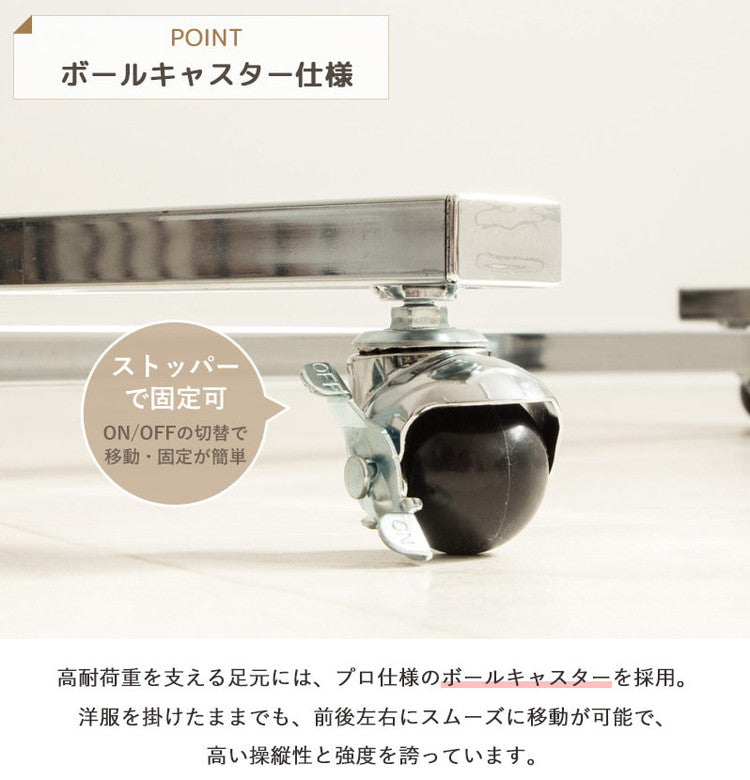 頑丈なスチールパイプとそれを支える強度の高い構造で、耐荷重100kgを実現したパイプハンガー! シャツやジャケットはもちろん、冬用のコートやダウンジャケットもたっぷり掛けられるパワフルな収納力で、たわまず、ゆがまず安心・安全にお使いいただけます。 ご家庭のハンガーラックとしてのご使用はもちろん、業務用にもお使いいただけるシンプル&高品質なハンガー!