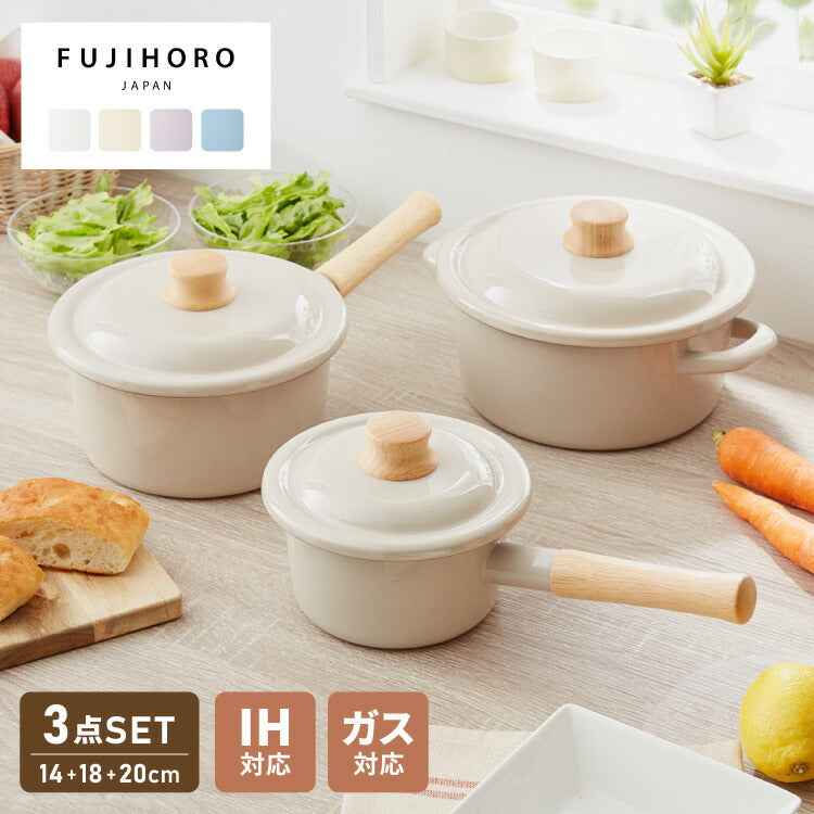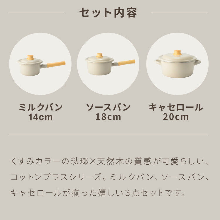 富士ホーロー コットンプラス ミルクパン14cm+ソースパン18cm+キャセロール20cm 3点セット フタ付き ガス火・IH対応 片手鍋 両手鍋 ホーロー鍋 可愛い かわいい 琺瑯 ホーロー FUJIHORO