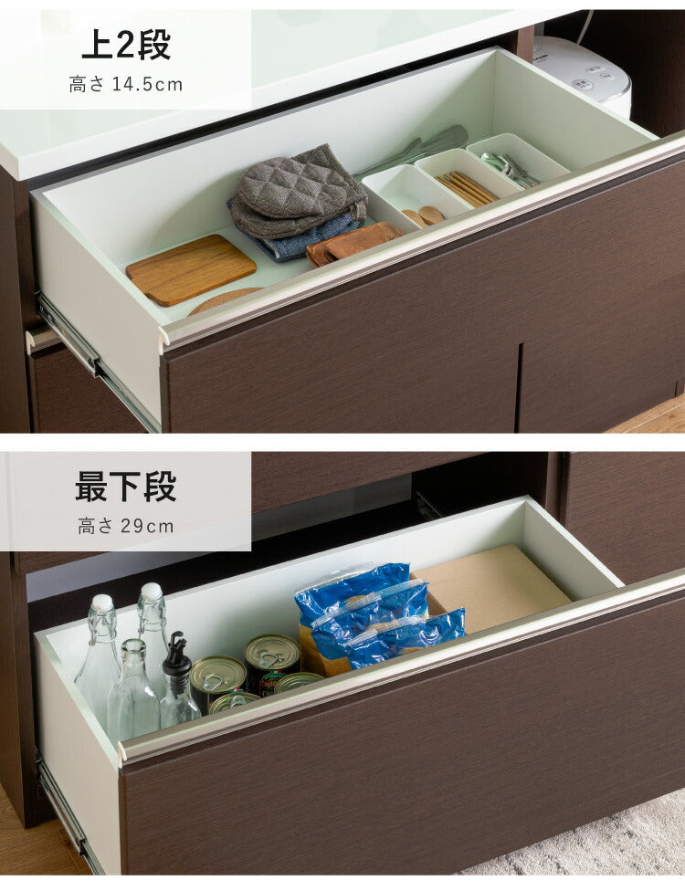 ・引き出しはフルオープンのスライドレールだから開け閉めがとっても静かで奥の物まで取り出しやすい!
