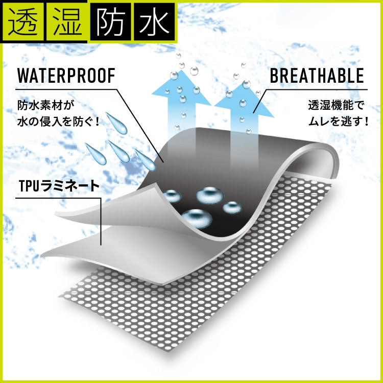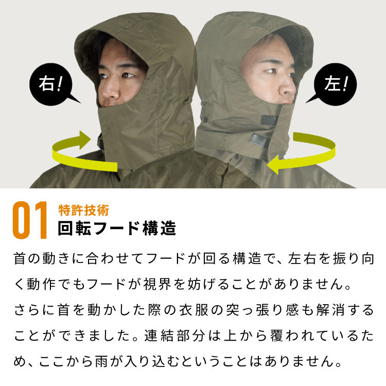 フードとボディ部分を分離した独自の回転フードを搭載し、驚異的な視界を実現した革新的レインスーツです。