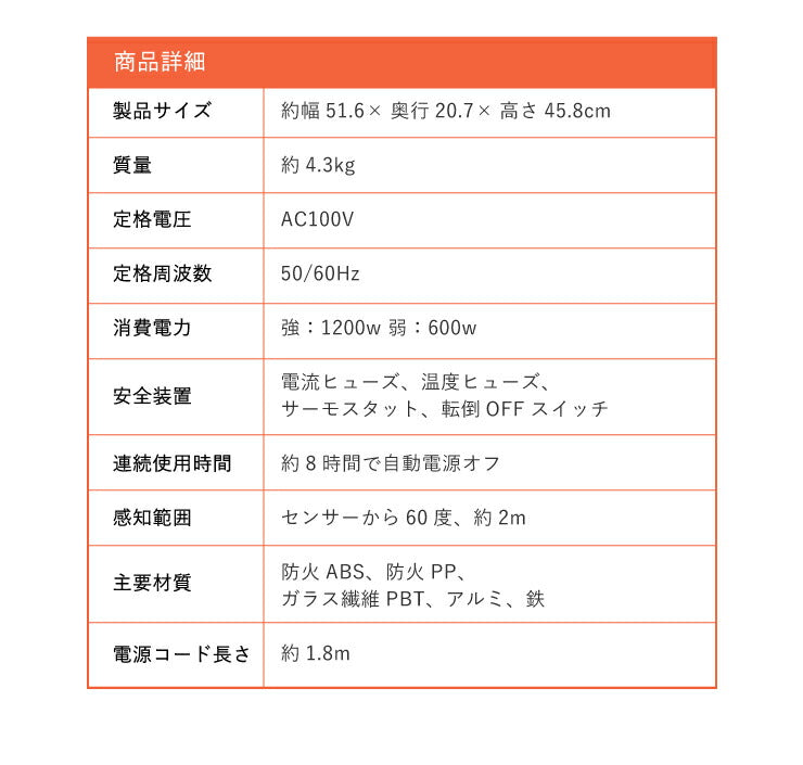 安全装置:温度ヒューズ、電流ヒューズ、サーモスタット、転倒OFFスイッチ