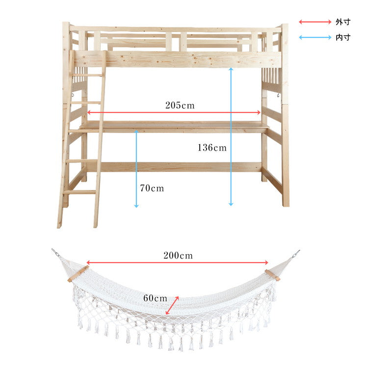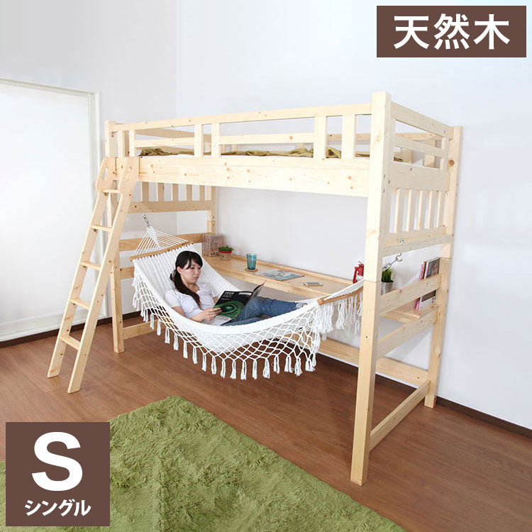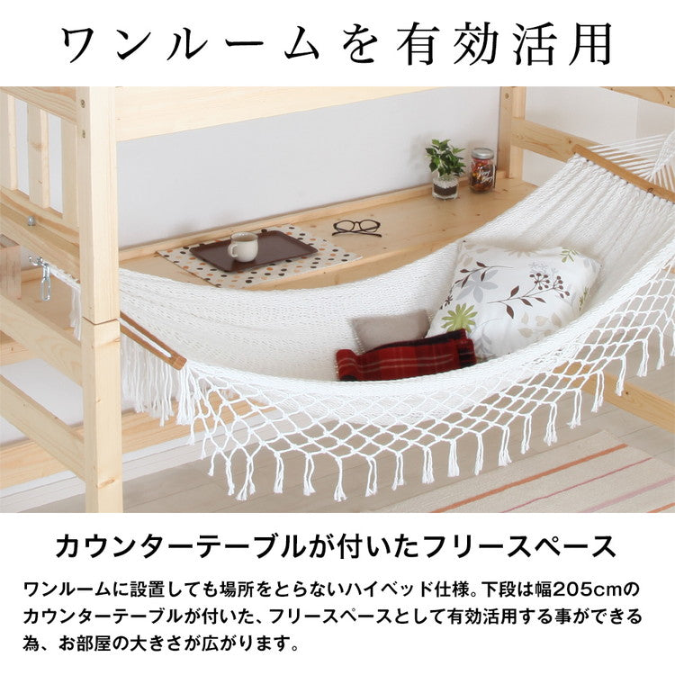 天然木ハンモック付きハイベッド ハイベッド ロフトベッド 天然木 システムベッド すのこベッド シングル デスク 北欧 (代引不可)