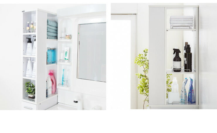 落下防止ガードが全棚付き、洗面所等で化粧瓶等を並べて使用しても安心。