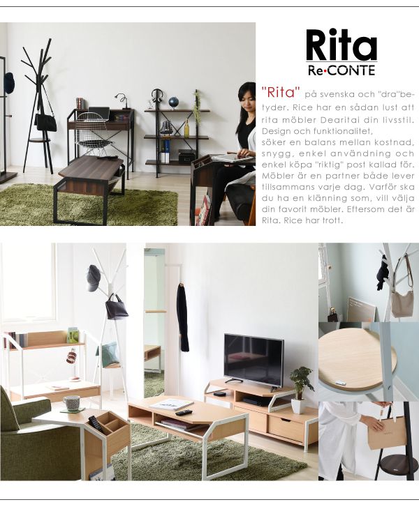 Ritaシリーズは熱や水に強く、傷がつきにくいので、メンテナンスが容易です。スチールは鋭角な部分を排除し、やさしい作りになっています。真ん中に棚板を設置し、脚元にも収納スペースを確保しました。ハンガー部は1本長くアシンメトリなデザインになっています。お部屋に戻った際のコートや、鞄掛けに。デザインが、お部屋のアクセントになります。