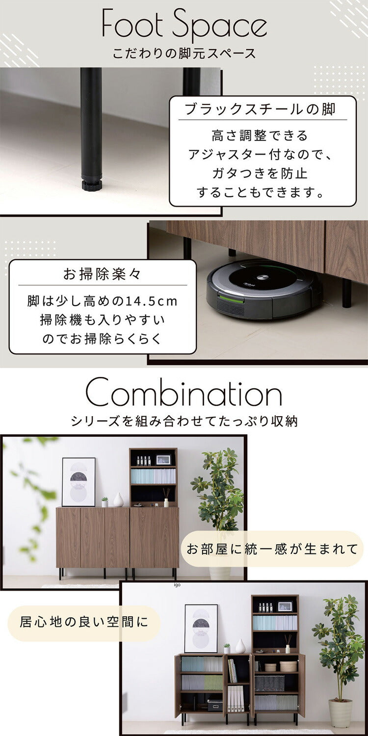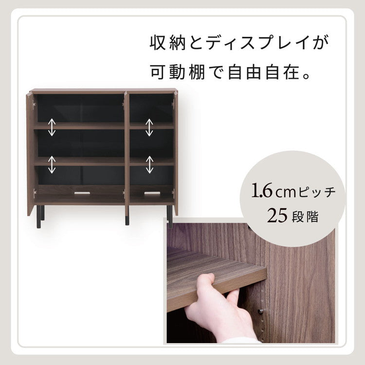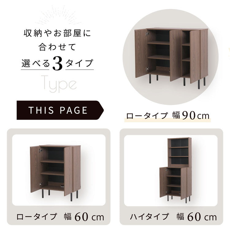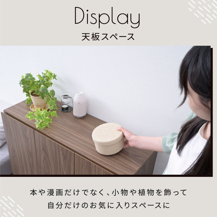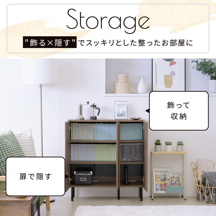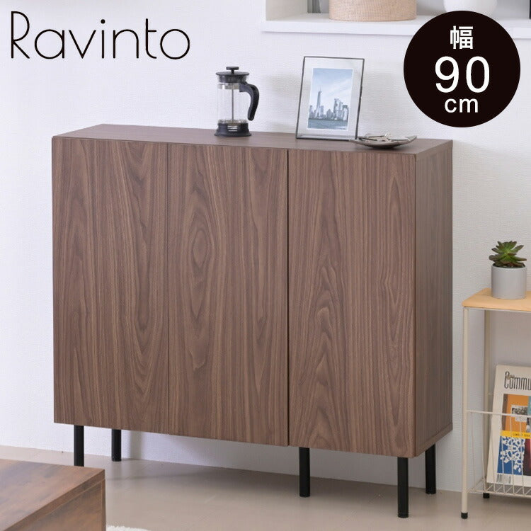 幅90cmのワイドな扉付き本棚ロータイプ"Ravinto"。左右の扉内収納にはそれぞれ可動棚が2枚ずつ付いているので、収納したい本や小物に合わせて高さを調整可能な本棚