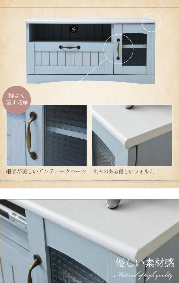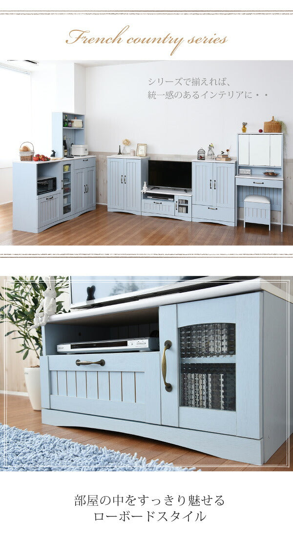 バイカラーで魅せるフレンチカントリースタイルのテレビ台。コンパクトサイズなので一人暮らしにも最適。AV機器収納から、DVDなどのメディアの収納にも最適な引出し、扉収納もあります。丸みを帯びたフォルムと、アンティーク調の取っ手といったディテールがカントリーテイストを漂わせます。