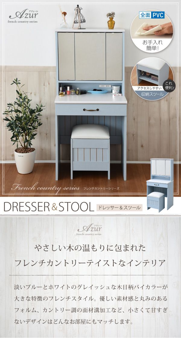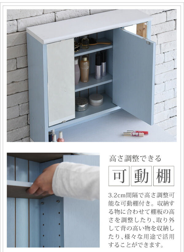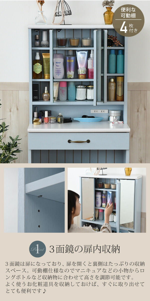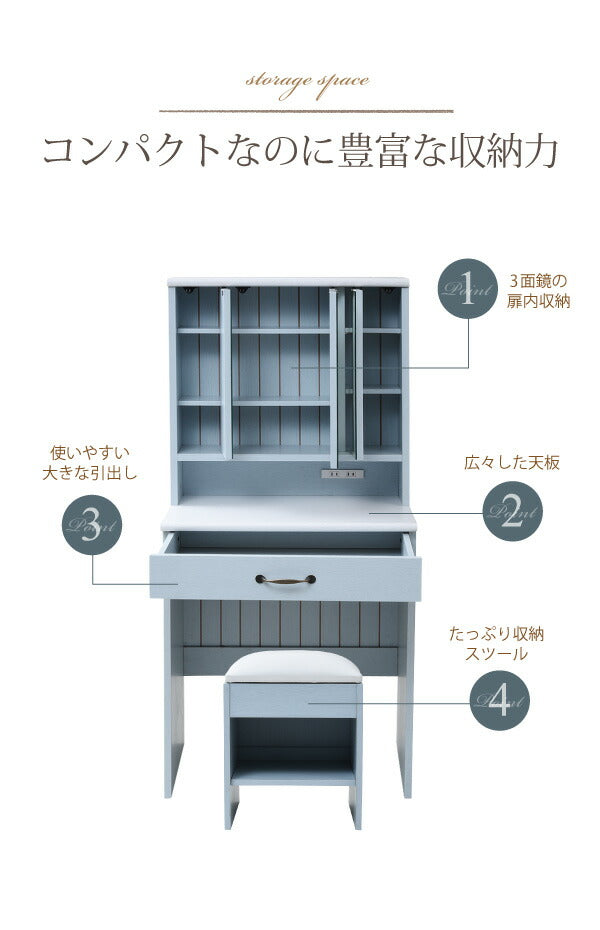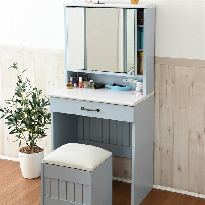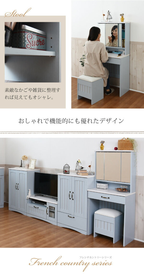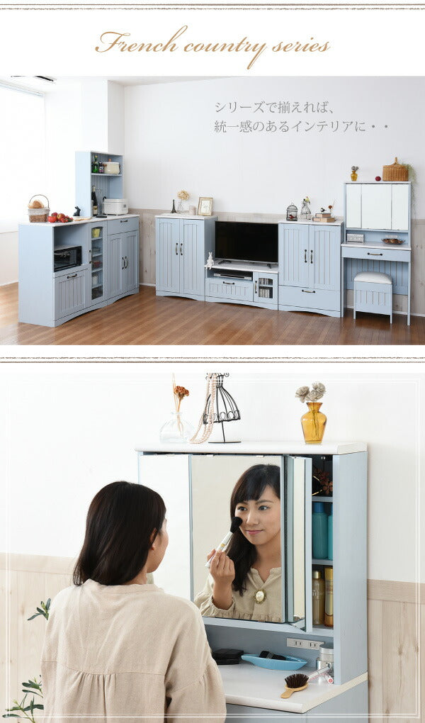 バイカラーで魅せるフレンチカントリースタイルの三面鏡ドレッサー&スツール。コンパクトサイズなので一人暮らしにも最適。三面鏡扉の裏は、たっぷり収納できる空間。可動棚で自由に調整できます。広々とした天板で、毎日のメイクも快適に。広めの引出は小物のコスメの収納に最適。セットのスツールは座面下にも収納スペースがあります。丸みを帯びたフォルムと、アンティーク調の取っ手といったディテールがカントリーテイストを漂わせます。