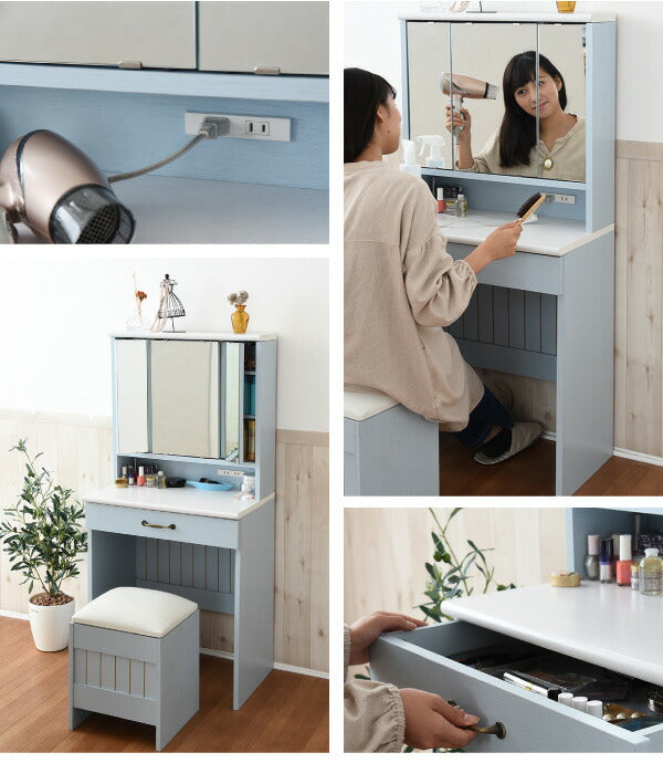 フレンチカントリー 三面鏡 ドレッサー コンセント付き 幅60 隠し収納庫付 椅子 付き メイク ドレッサー 収納 3面鏡 化粧台 姫(代引不可)