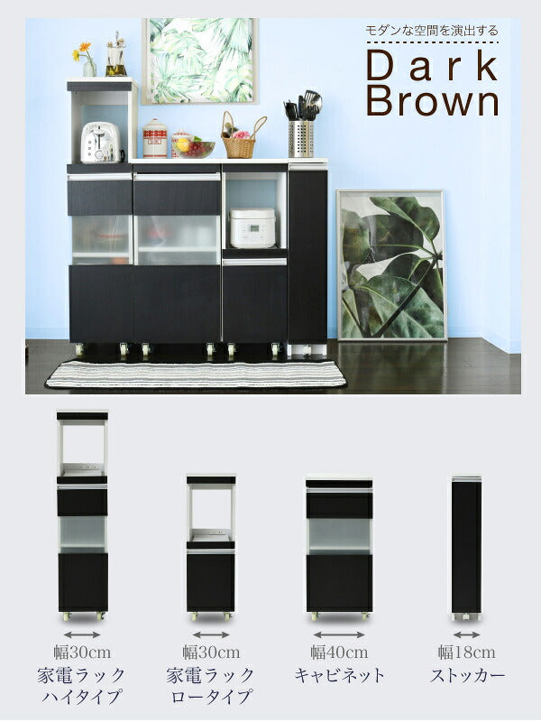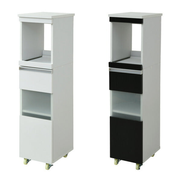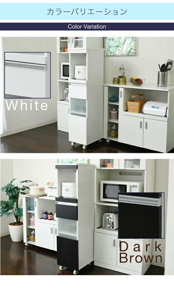 家電の収納に便利なコンセント付きスライド棚と、収納物に合わせて高さ調節ができる可動棚付きのラックをこれ1台で。ハイタイプは収納量も抜群。キッチンのちょっとした隙間に設置すれば、それまでのデッドスペースを有効活用できます。