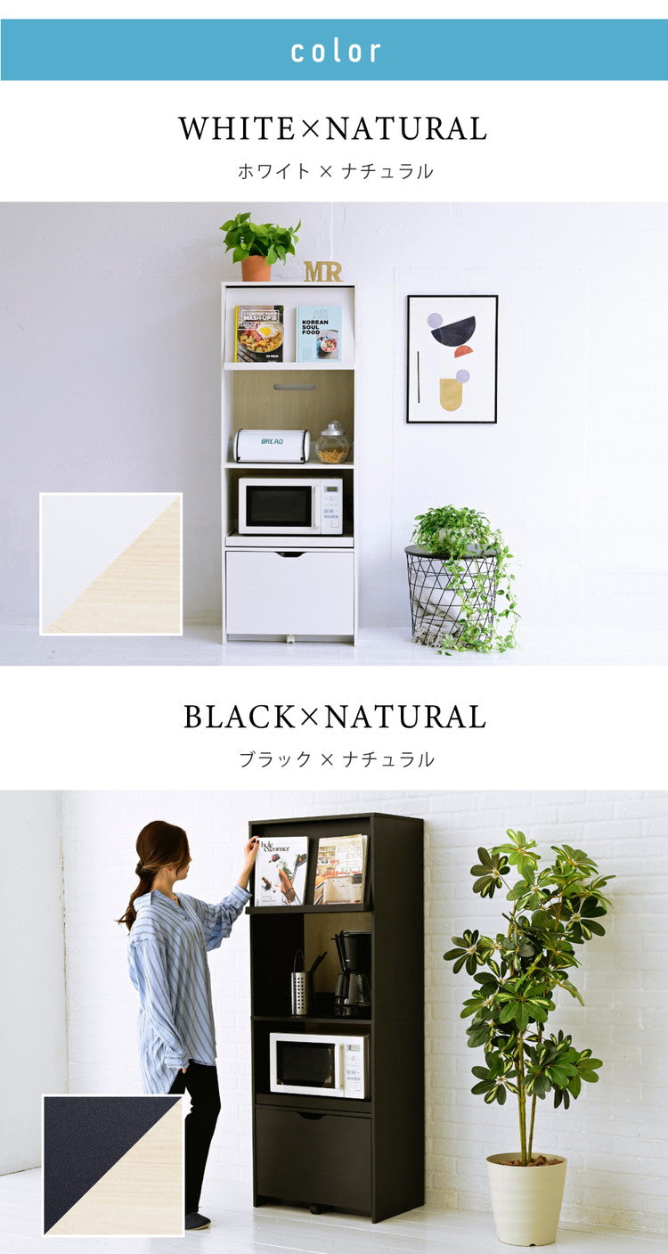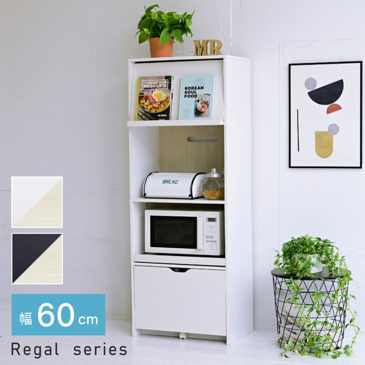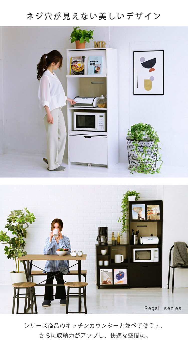 さりげないツートーンが印象的なキッチンシリーズRegal。コンパクトながらもオープンラックやスライド収納、フラップ扉に引き出し収納など、豊富な収納を備えた機能的なキッチンカウンターです。引き出しは2Lのペットボトルも入るサイズ設計。