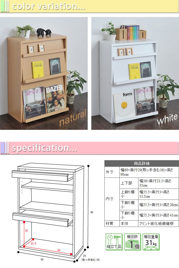 [内寸](上下部)幅56×奥行23.5×高さ35cm(上飾り棚小)幅55.5×奥行2.5×高さ13.5cm(上飾り棚大)幅55.5×奥行2.5×高さ26cm(下飾り棚)幅55.5×奥行2.5×高さ41cm(可動棚)幅56×奥行22.5×厚み1.8cm(3.2cmピッチ5穴)