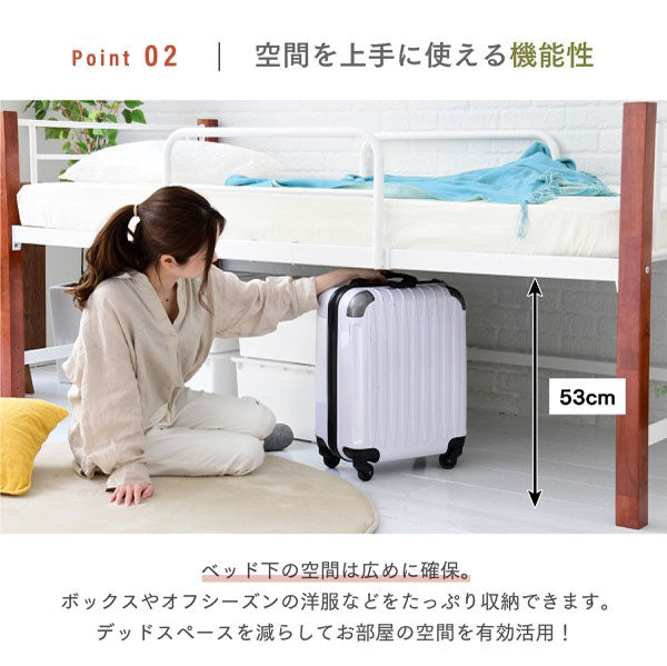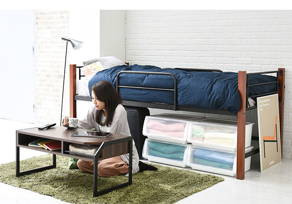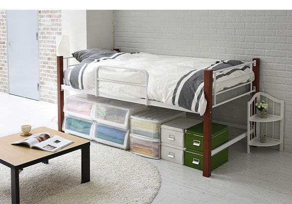 天然木の支柱がおしゃれなパイプベッド。高さはミドルタイプなので、ベッドの下には収納スペースがあり、プラスティックケースなどが入れられます。