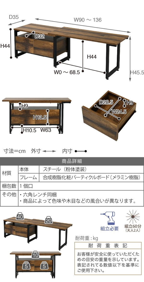 幅90~136×奥行35×高さ45.5cm