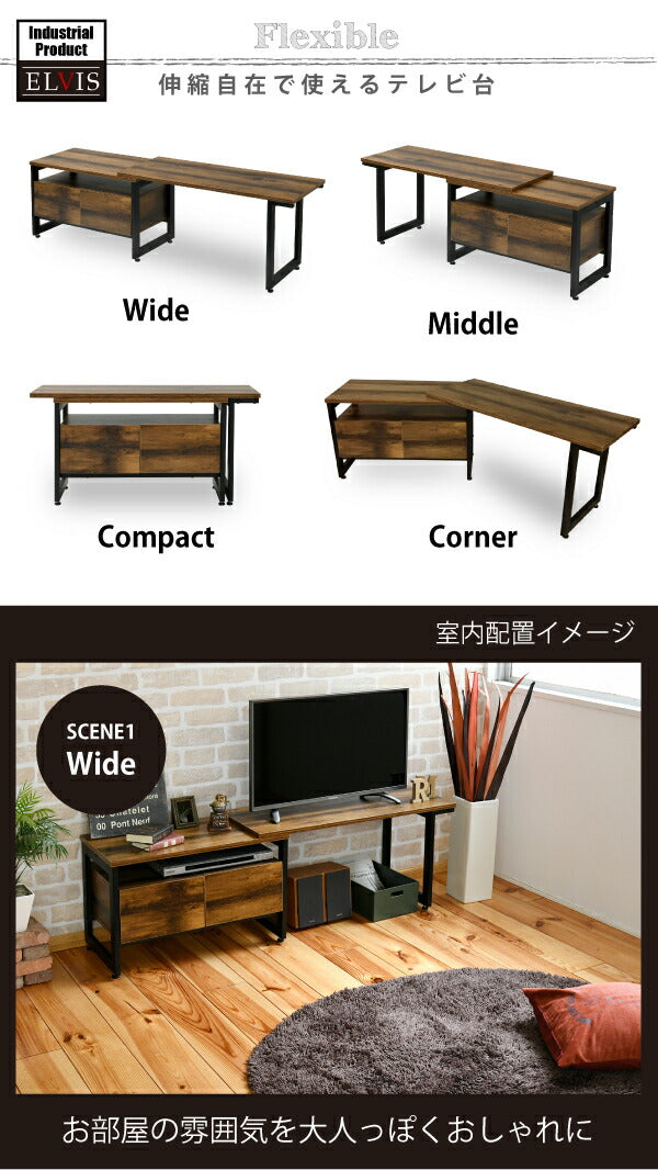 美しさと機能性を兼ね備えた、シンプルながらも深みのあるデザインのテレビ台。伸縮式なのでお部屋のレイアウトに合わせて調整できます。引き出しにはDVD、ブルーレイ等が収納可能。雰囲気のあるインダストリアルスタイルを気軽にお楽しみいただけます。