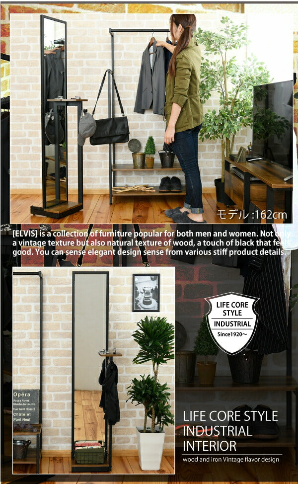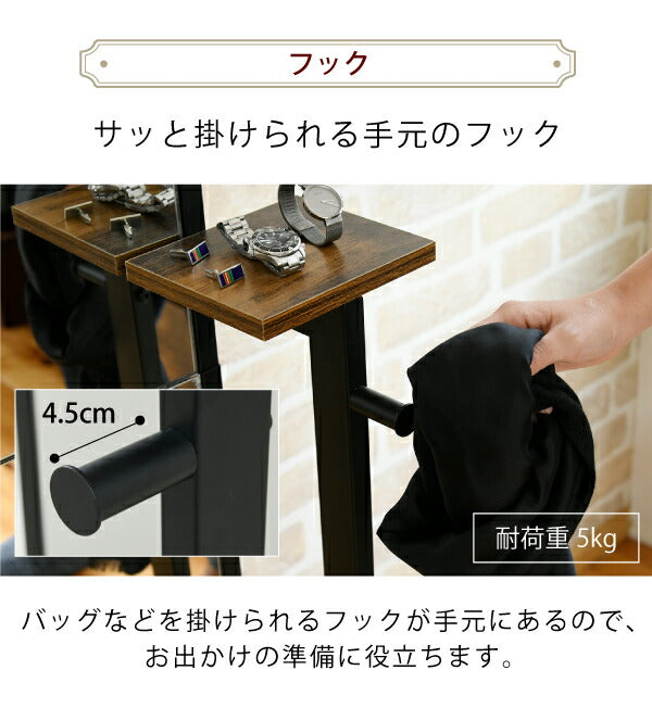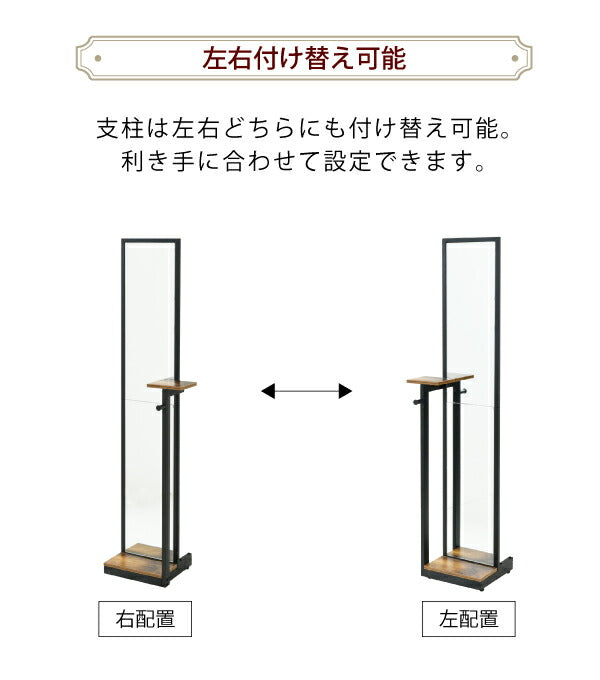 美しさと機能性を兼ね備えた、シンプルながらも深みのあるデザインのスタンドミラー。手元にある小さな棚は、身だしなみを整える時などちょっと小物を置くのに最適。雰囲気のあるインダストリアルスタイルを気軽にお楽しみいただけます。