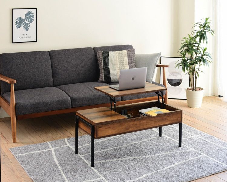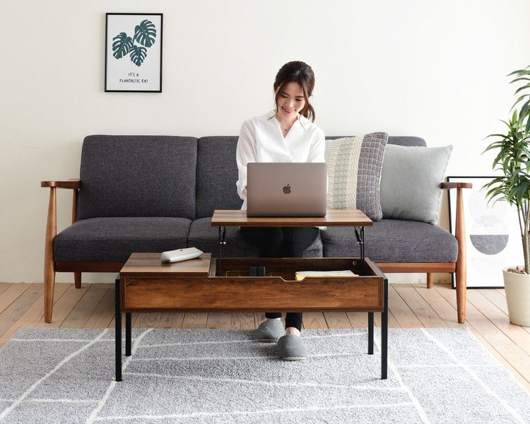 美しさと機能性を兼ね備えた、シンプルながらも深みのあるデザインのリフティングテーブル。普段は天板を閉じてリフティングテーブルとして。天板を上げるとソファに座って作業するのにちょうどいい高さに。わざわざデスクを置かなくても在宅ワークに対応できるテーブルです。