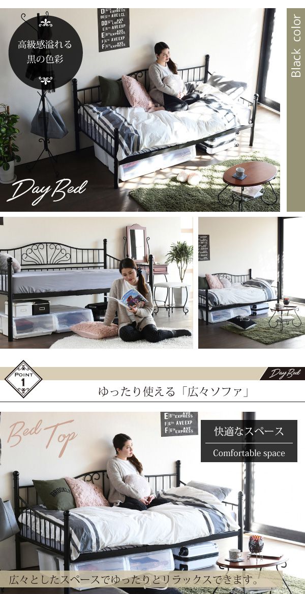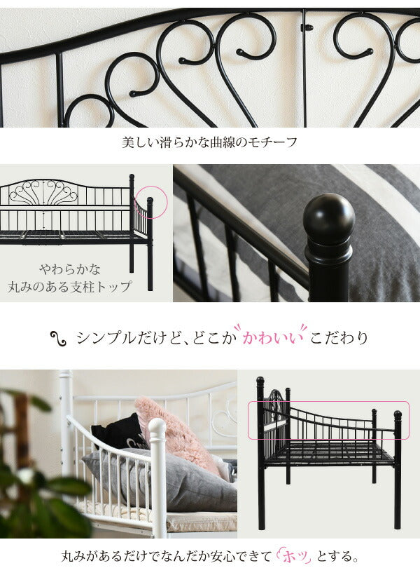 昼はソファ、夜はベッドと、2つのスタイルで使えるアンティーク調のデイベッド。ロートアイアンの装飾がエレガントな空間を演出し、アンティーク調の家具や小物との相性もバッチリ。