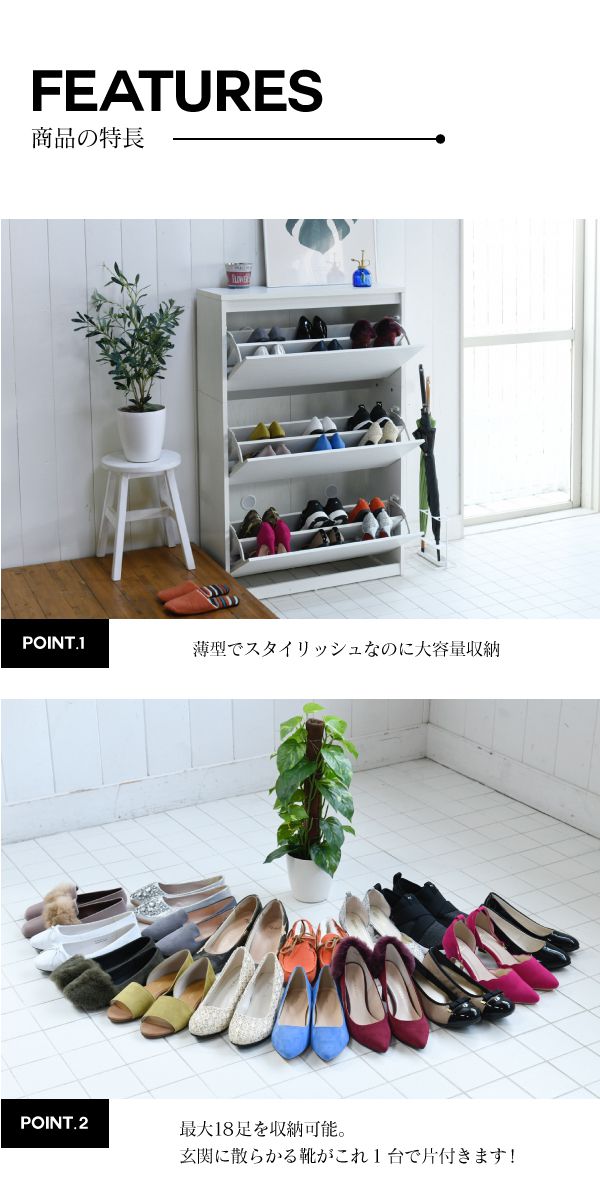 玄関の限られたスペースでも場所を取らない薄型設計のシューズボックス。扉がフラップ仕様になっており、玄関にあふれた靴をすっきり収納できて見た目もスタイリッシュ。ワイドタイプは高さが123cmと低めなので、写真や雑貨をディスプレイしたり出かける際に持ち歩く鍵や定期入れなどを置いたりするのにもぴったりです。
